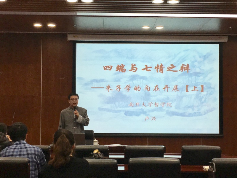 卢兴首先从文本出处入手,将四端——“恻隐之心”、“羞恶之心”、“辞让之心”、“是非之心”总归为道德情感,将七情——“喜”、“怒”、“哀”、“惧”、“爱”、“恶”、“欲”总归为自然情感。而后展开论述了朱子哲学的义理结构,包括理气关系、道心人心关系、天命之性与气质之性等诸多哲学问题,对这些问题的解答构成了朱子学中“四端“与“七情”及其关系问题的基础,同时也成为了朱子后学展开“四端与七情之辩”的理论基石。然后正式回归到从”东亚视角”回观中国哲学的方法论,重点讲解了在朝鲜前期关于“四端与七情之辩”的第一次高潮——“退溪与高峰之辩”。将退溪与高峰二人的论辩归结为以“四七同异”、“理发气发”、“四七善恶”、“本性气禀”及“道心人心”等五个焦点,并详化了整个论辩过程及其在韩国儒学史上的意义,这场长达八年、往来四万余字的论辩为性理学奠定哲学基础,并为后世学者的研究提供了宝贵资源。最后,卢兴分析了儒家情感哲学的发展逻辑,将从孟子、朱子到退溪在“四端与七情”问题上的发展过程归结为“四七之分—四七之合—四七之分”,呈现出正题—反题—合题的发展逻辑,并对这一演进逻辑的内外原因作出分析。