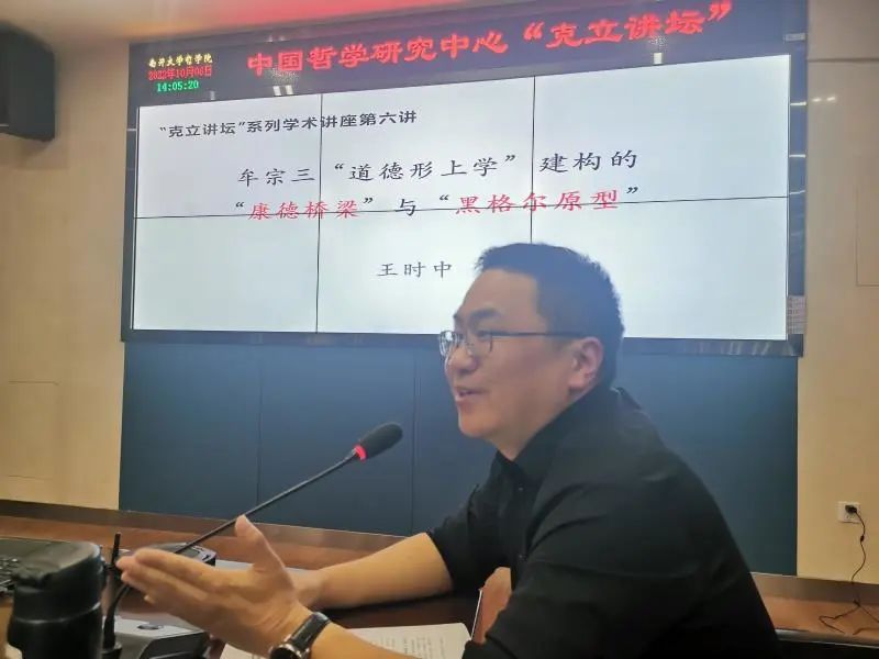 2022年10月6日下午,伟德国际victor1946中国哲学研究中心举办了“克立讲坛”系列学术讲座的第六讲,讲座主题为:“牟宗三道德形上学建构的康德桥梁与黑格尔原型”,此次讲座由马克思主义哲学教研室主任王时中教授担任主讲人,中国哲学教研室廖娟老师担任主持人,中国哲学研究中心主任卢兴教授担任评议人。中国哲学教研室郑随心老师,马克思主义哲学教研室牛子牛老师出席讲座,研究生、本科生百余人线上线下共同参与讲座。讲座伊始,王时中教授表示,自己虽然没有专门从事中国哲学研究,但是一直对五四以来中国的各类思潮十分关注,认为有必要对其建立一种研究的坐标与框架。同时也希望借此次讲座的机会更好地实现学科之间的交流与会通。王教授还谈到了自己和方克立先生的相识过程,对方先生的学术贡献给予了高度的肯定,并表达了自己对方先生的仰慕与尊敬。接下来,王时中教授从“牟宗三的道德形上学的康德桥梁”“牟宗三的道德形上学的黑格尔原型”“对牟宗三的道德形上学的同情的理解”“对牟宗三的道德形上学的再推进”四个部分展开了讲座的内容。王教授认为,牟宗三充分肯定康德道德形而上学的用意在于援引康德来论证中国的道德传统也具有先验性与普遍性。与此同时,牟宗三也