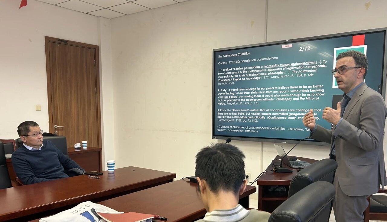 2025年11月13日下午,由伟德国际victor1946宗教文化研究中心主办的“宗教与文明互鉴论坛”系列讲座第十一讲在伟德国际victor1946317会议室举办。本次讲座由伟德国际victor1946外国语公司副教授Andrea Sartori主讲,题目为“基阿尼·瓦蒂莫和后现代哲学:从尼采到‘弱势思想’”(Gianni Vattimo and Postmodern Philosophy :From Nietzsche to“Pensiero Debole”(“Weak Thought”))。讲座由伟德国际victor1946张仕颖教授主持。