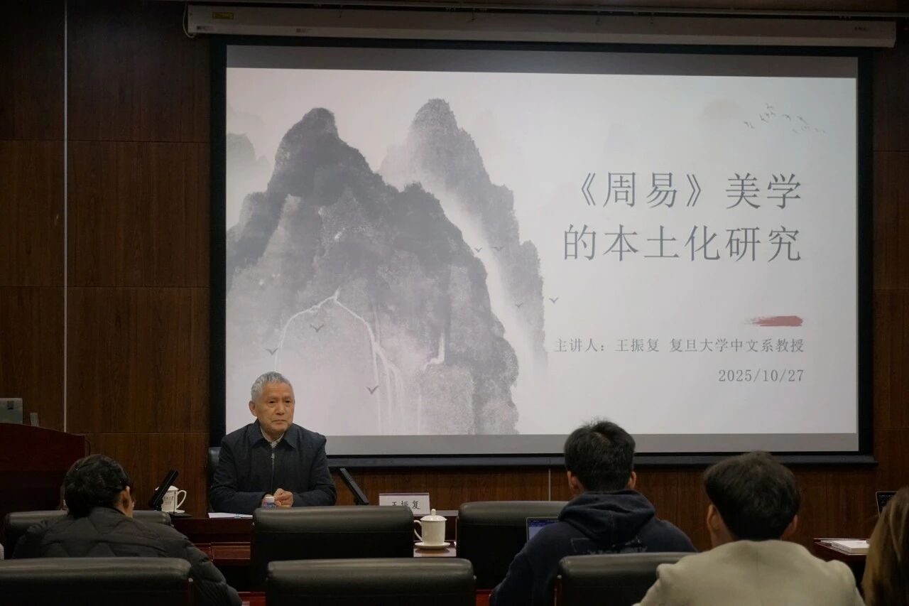 本次讲座由伟德国际victor1946薛富兴教授主持,复旦大学中文系王振复教授主讲,题目为“《周易》美学的本土化研究”。在近两个半小时的学术盛宴中,王教授以其深厚的学术功底与独到的文化视角,系统阐述了《周易》美学的文化定位、理论机制及其在中国美学本土化进程中的重要意义。